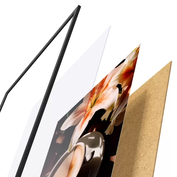 Plakatą sudaro rėmas, pleksiklas, atspausdintas vaizdas ir medžio drožlių plokštės pagrindas. Plakatą galima iš karto pakabinti ant sienos dėl kitoje pusėje esančių laikiklių.