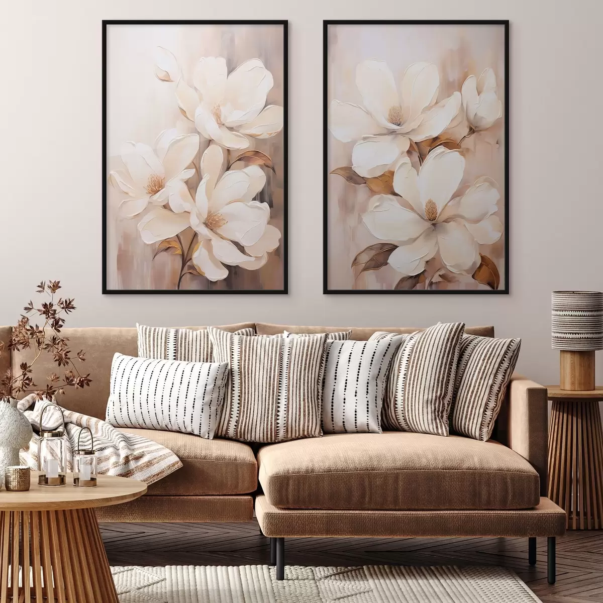 Plakatas Baltos magnolijos žiedai švelniame, neryškiame smėlio ir rudų tonų fone, tapybos stilius d00655