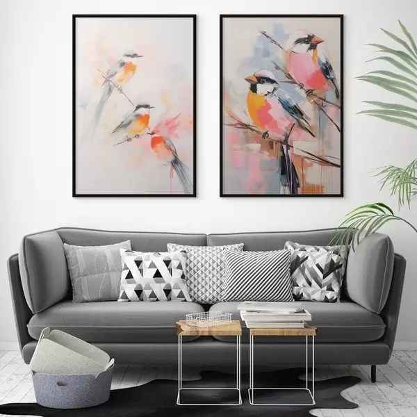 Plakatas Paukščiai ant šakų , švelnios pastelinės spalvos, šviesus rausvų ir baltų atspalvių fonas Ne d00658