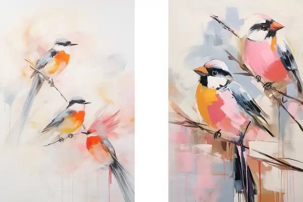 Plakatas Paukščiai ant šakų , švelnios pastelinės spalvos, šviesus rausvų ir baltų atspalvių fonas Ne d00658