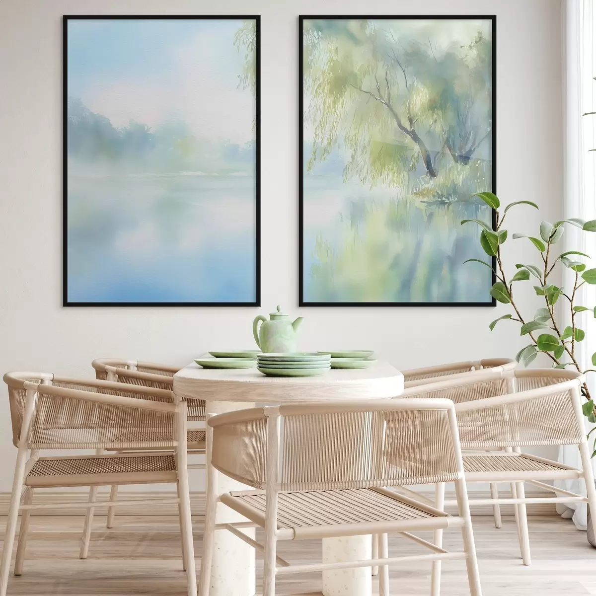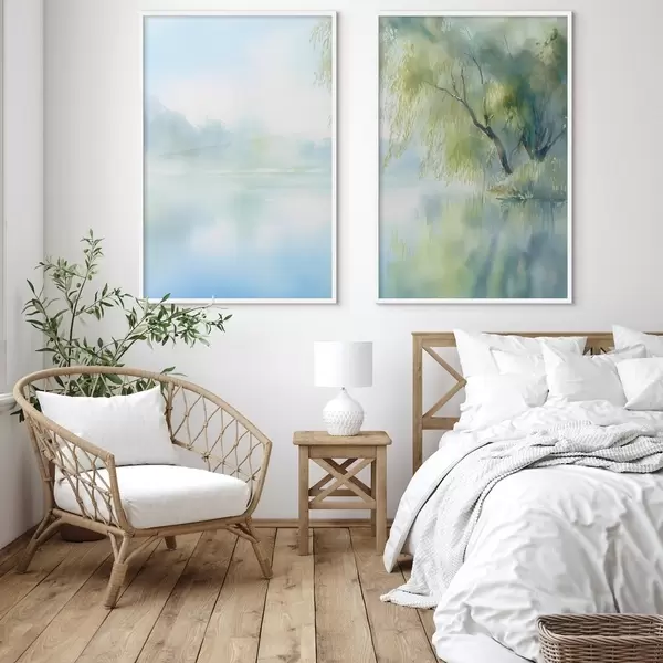 Plakatas vandeniu dažais tapytas gluosnis ant ežero kranto d00702