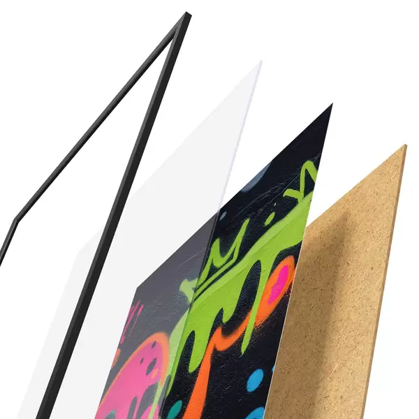 Plakatą sudaro rėmas, pleksiklas, atspausdintas vaizdas ir medžio drožlių plokštės pagrindas. Plakatą galima iš karto pakabinti ant sienos dėl kitoje pusėje esančių laikiklių.