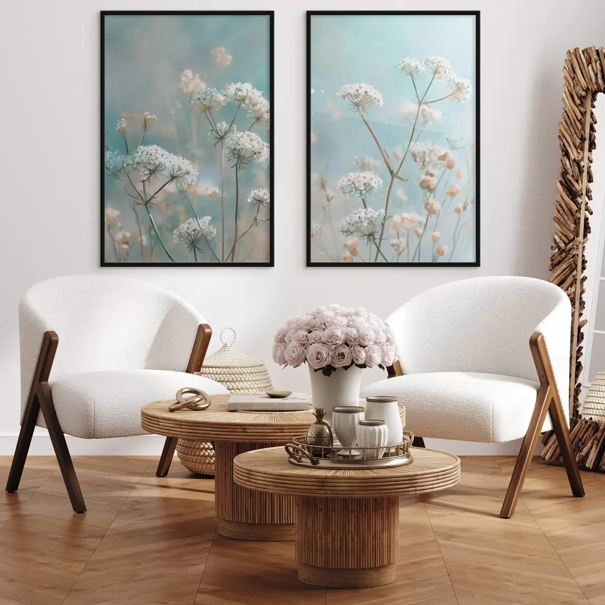 Plakatas Mėlyname fone akvarelės stiliaus karalienės Anos nėrinių gėlės d00705