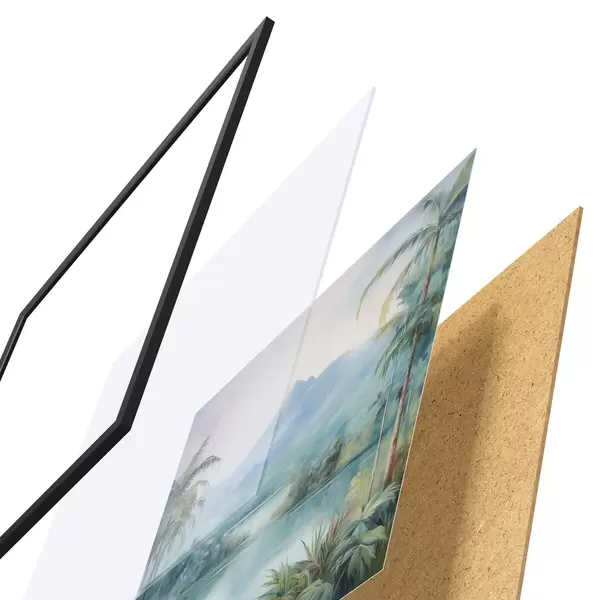 Plakatą sudaro rėmas, pleksiklas, atspausdintas vaizdas ir medžio drožlių plokštės pagrindas. Plakatą galima iš karto pakabinti ant sienos dėl kitoje pusėje esančių laikiklių.