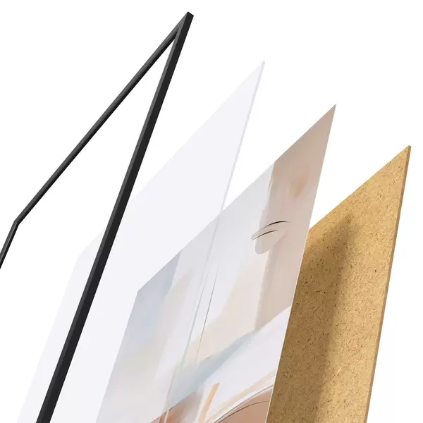 Plakatą sudaro rėmas, pleksiklas, atspausdintas vaizdas ir medžio drožlių plokštės pagrindas. Plakatą galima iš karto pakabinti ant sienos dėl kitoje pusėje esančių laikiklių.