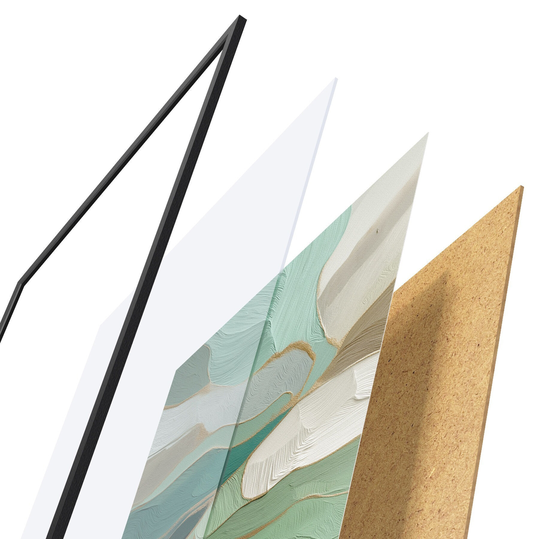 Plakatą sudaro rėmas, pleksiklas, atspausdintas vaizdas ir medžio drožlių plokštės pagrindas. Plakatą galima iš karto pakabinti ant sienos dėl kitoje pusėje esančių laikiklių.