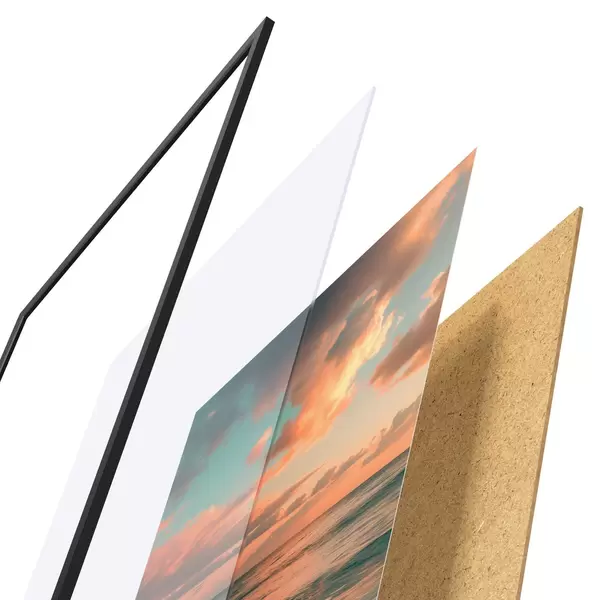 Plakatą sudaro rėmas, pleksiklas, atspausdintas vaizdas ir medžio drožlių plokštės pagrindas. Plakatą galima iš karto pakabinti ant sienos dėl kitoje pusėje esančių laikiklių.