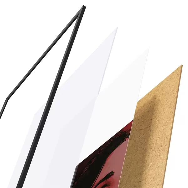 Plakatą sudaro rėmas, pleksiklas, atspausdintas vaizdas ir medžio drožlių plokštės pagrindas. Plakatą galima iš karto pakabinti ant sienos dėl kitoje pusėje esančių laikiklių.