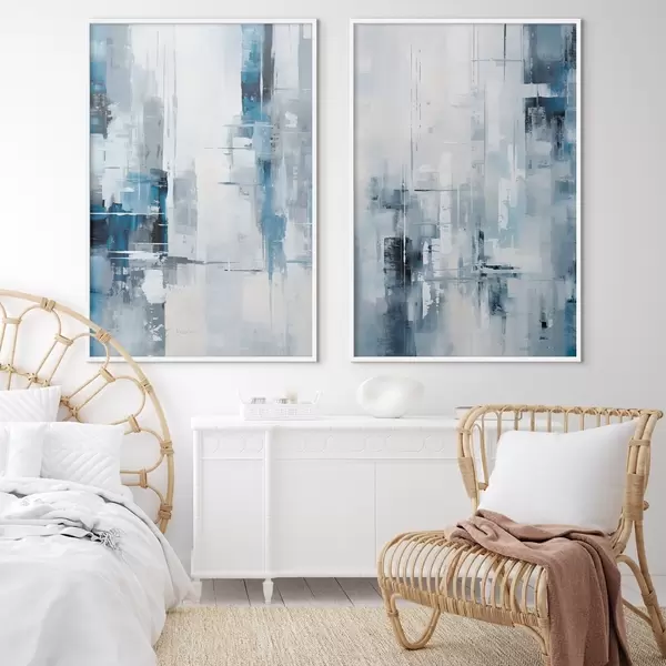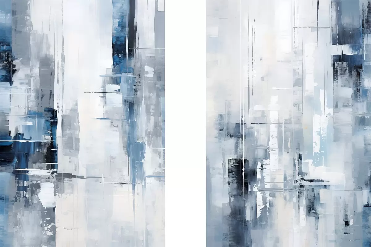 Plakatas Abstraktaus tapybos imitacija mėlyna, pilka ir balta spalvomis, vertikaliomis linijomis ir geometrinėmis formomis Ne d00819
