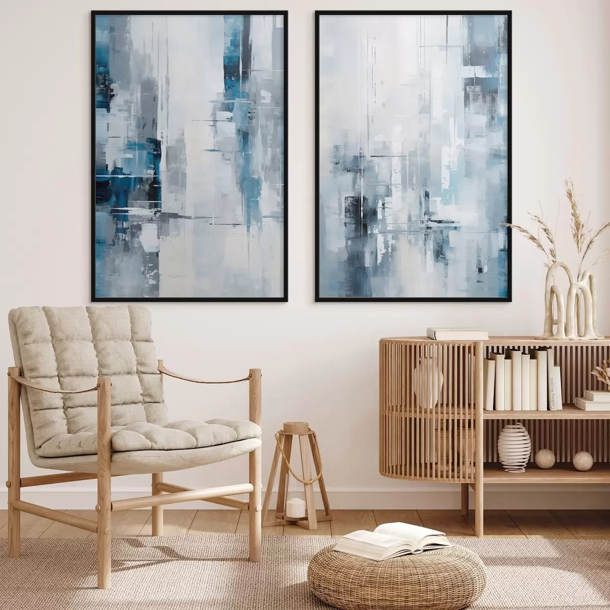 Plakatas Abstraktaus tapybos imitacija mėlyna, pilka ir balta spalvomis, vertikaliomis linijomis ir geometrinėmis formomis d00819