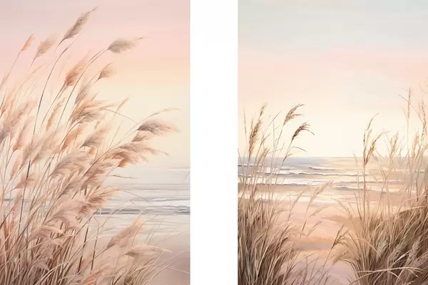 Plakatas Pampų žolė su pastelinės oranžinės spalvos palete, šviesiai rožinis dangus, ramus kraštovaizdis d00823