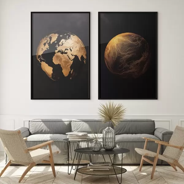 Plakatas Tekstūruotas abstraktus žemės gaublys ir planeta juodame fone, modernus minimalistinis menas Ne d00827