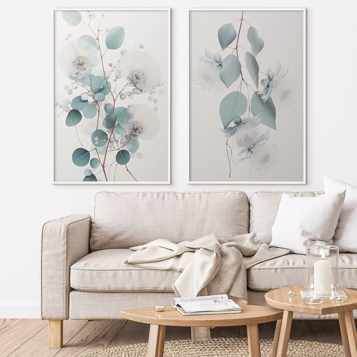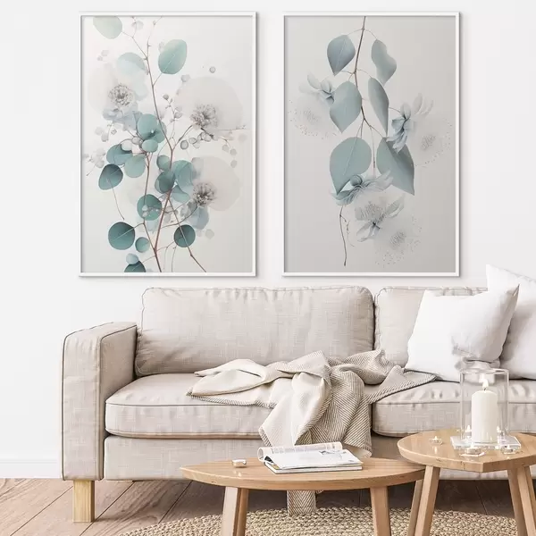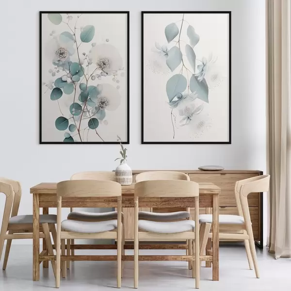 Plakatas Eukalipto šaka su mėlynais lapais ir baltais žiedais, šviesus fonas Ne d00829