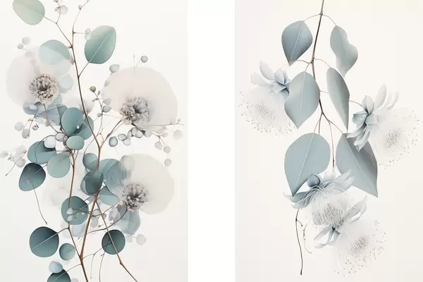 Plakatas Eukalipto šaka su mėlynais lapais ir baltais žiedais, šviesus fonas Ne d00829