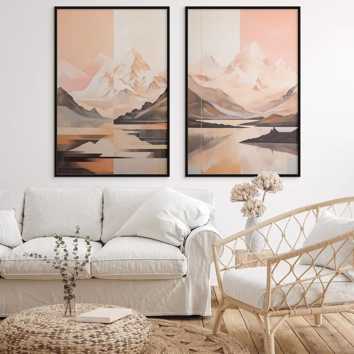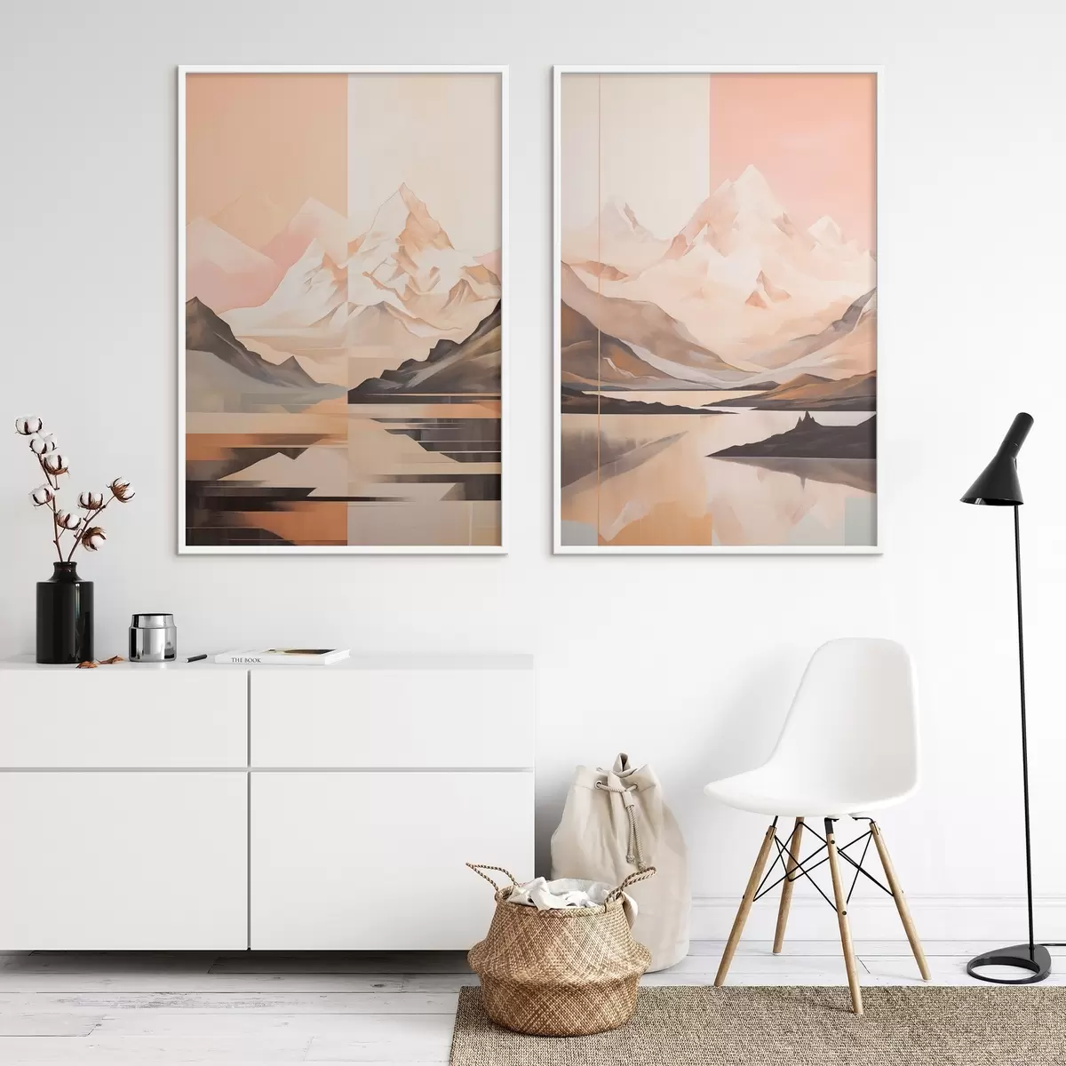 Plakatas Abstraktus peizažas su kalnais ir ežeru, pastelinės spalvos, minimalistinis stilius d00830