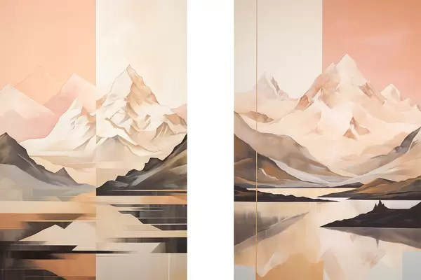 Plakatas Abstraktus peizažas su kalnais ir ežeru, pastelinės spalvos, minimalistinis stilius d00830