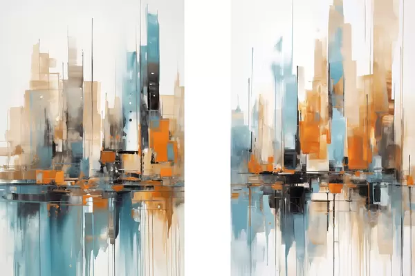 Plakatas Abstraktus miesto peizažas su vertikaliais potėpiais oranžinių, mėlynų ir baltų atspalvių, tapybos stilius d00876