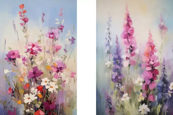 Plakatas Ryškios gėlės su baltomis saulėgrąžomis lauke, švelnūs teptuko potėpiai, pastelinės spalvos, impresionistinis stilius d00882