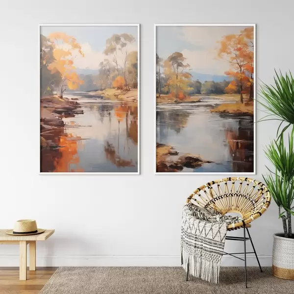 Plakatas Rudens peizažas, upė su medžiais krante, miškas fone, atspindžiai vandenyje d00883