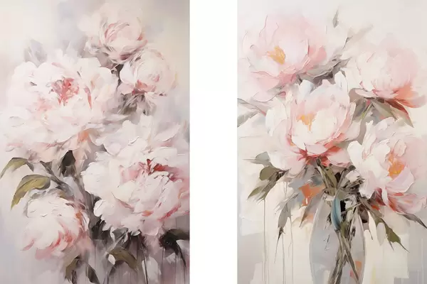 Plakatas Šviesiai rožinių bijūnų puokštė su žaliais lapais, švelniais potėpiais, pastelinėmis spalvomis, šviesiu fonu Ne d00890