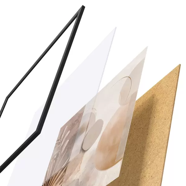 Plakatą sudaro rėmas, pleksiklas, atspausdintas vaizdas ir medžio drožlių plokštės pagrindas. Plakatą galima iš karto pakabinti ant sienos dėl kitoje pusėje esančių laikiklių.