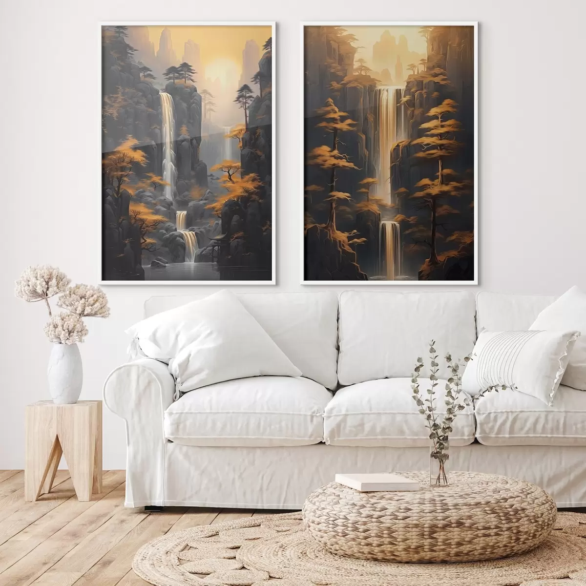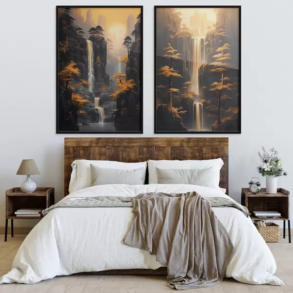 Plakatas Peizažas su kriokliu ir kalnais auksinėje šviesoje Ne d00928