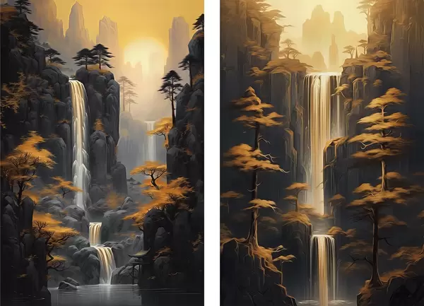 Plakatas Peizažas su kriokliu ir kalnais auksinėje šviesoje d00928