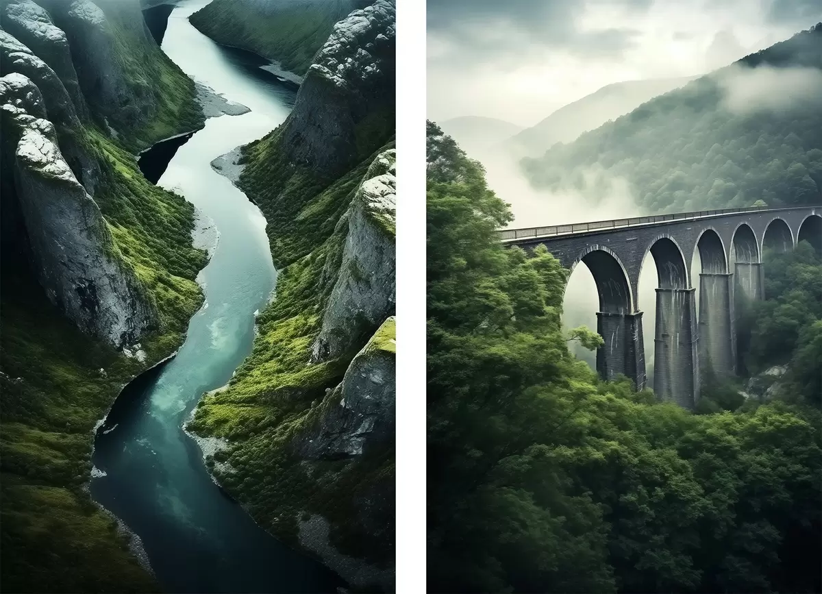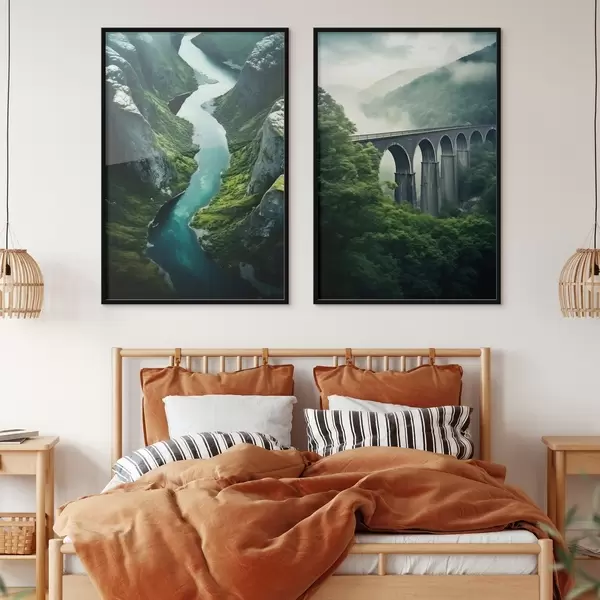 Plakatas Oro upės kanjonas ir rūko apgaubtas viadukas žaliuose kalnuose Ne d00967