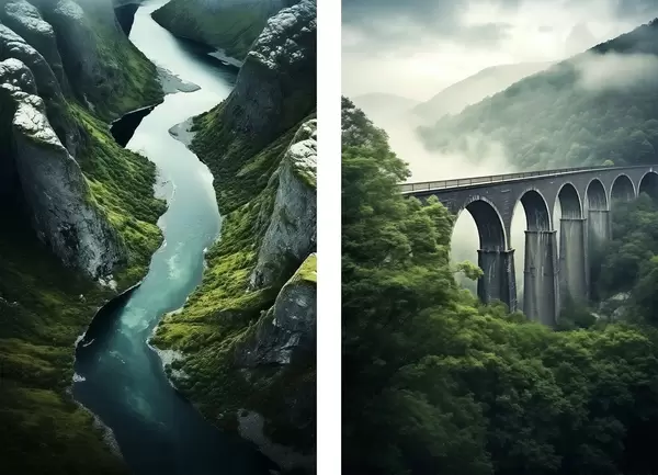 Plakatas Oro upės kanjonas ir rūko apgaubtas viadukas žaliuose kalnuose d00967