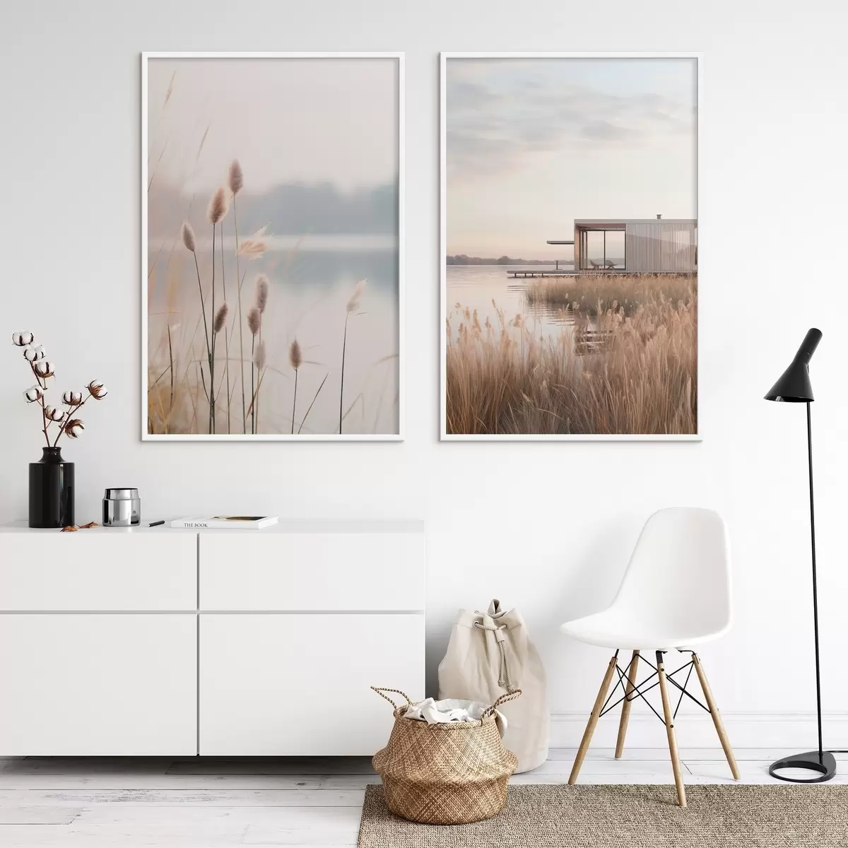 Plakatas Minkšti nendrės prie ramaus ežero ir moderni kabina krante Ne d00970
