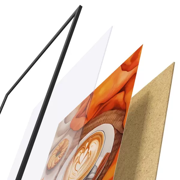 Plakatą sudaro rėmas, pleksiklas, atspausdintas vaizdas ir medžio drožlių plokštės pagrindas. Plakatą galima iš karto pakabinti ant sienos dėl kitoje pusėje esančių laikiklių.