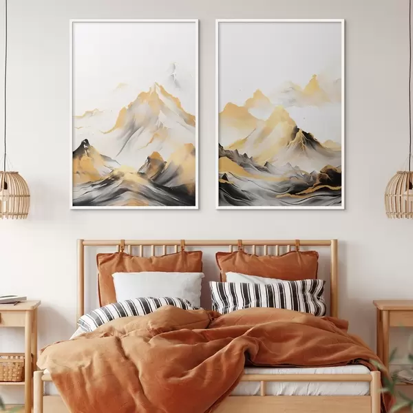 Plakatas Tekstūruotos geltonos ir juodos kalvos su snieguotomis viršūnėmis, tapybos stilius „ink wash“, minimalistinis kalnų masyvas d01002