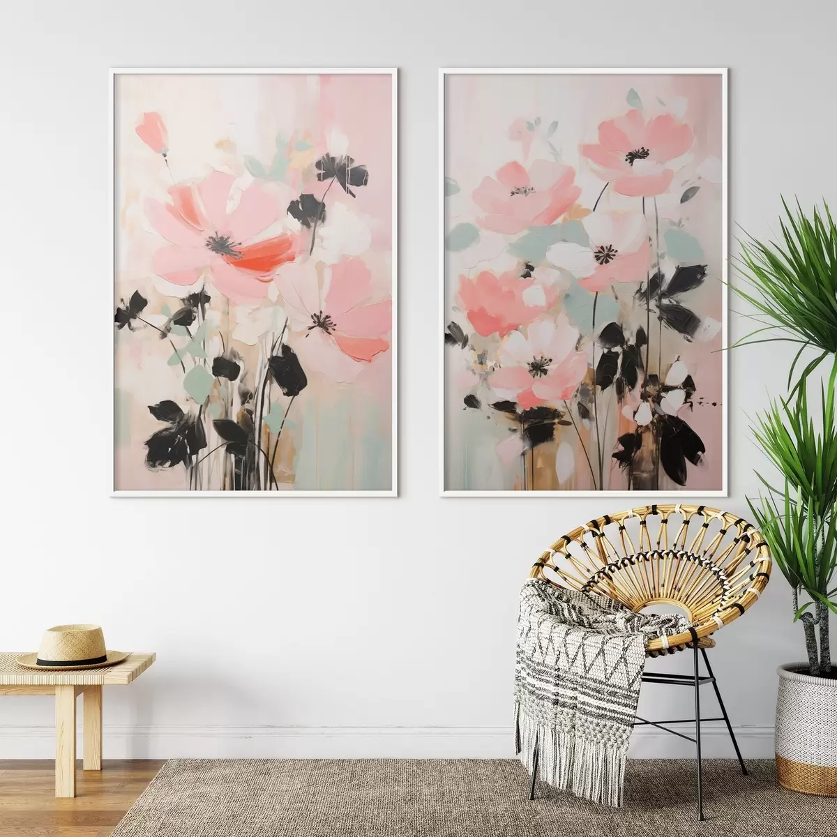 Plakatas Rožinės ir juodos gėlės su lapais, švelnios pastelinės spalvos, abstraktus gėlių kompozicija, minimalistinis menas d01004