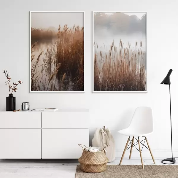 Plakatas Aukšti nendrės, augančios vandens telkinyje, vanduo atspindi nendres, rūko apgaubtas fonas, švelni šviesa, gamtos vaizdas Ne d01008