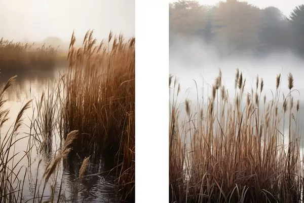 Plakatas Aukšti nendrės, augančios vandens telkinyje, vanduo atspindi nendres, rūko apgaubtas fonas, švelni šviesa, gamtos vaizdas d01008