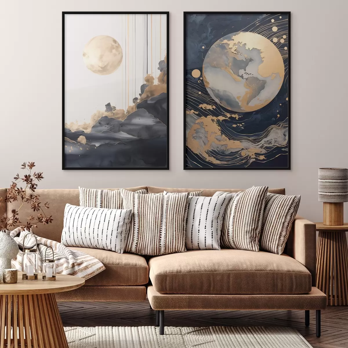 Plakatas Tekstūruota dekoratyvinė planeta kosmose su geltonomis linijomis ir taškais, abstraktus stilius, minimalistinis ir modernus d01014