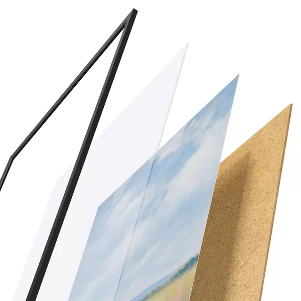 Plakatą sudaro rėmas, pleksiklas, atspausdintas vaizdas ir medžio drožlių plokštės pagrindas. Plakatą galima iš karto pakabinti ant sienos dėl kitoje pusėje esančių laikiklių.