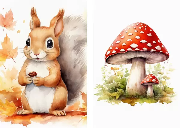 Plakatas Voverė ir miško grybas, musmirių, imitacija akvarele d01049