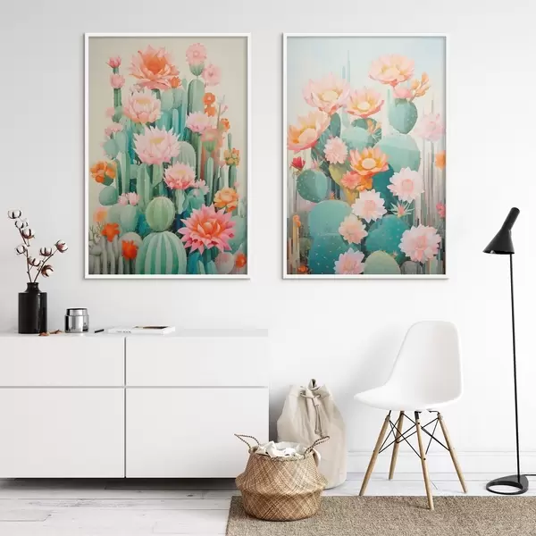 Plakatas Kaktusai su dideliais žiedais, pastelinė paletė ir ramybės jausmas d01086
