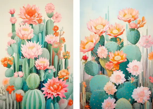 Plakatas Kaktusai su dideliais žiedais, pastelinė paletė ir ramybės jausmas d01086