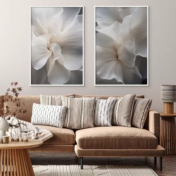 Plakatas Artimas vaizdas subtilaus abstraktaus balto gėlių žiedo su sudėtingomis linijomis ir neryškiu tamsiu fonu d01117