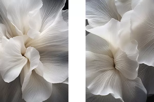 Plakatas Artimas vaizdas subtilaus abstraktaus balto gėlių žiedo su sudėtingomis linijomis ir neryškiu tamsiu fonu d01117