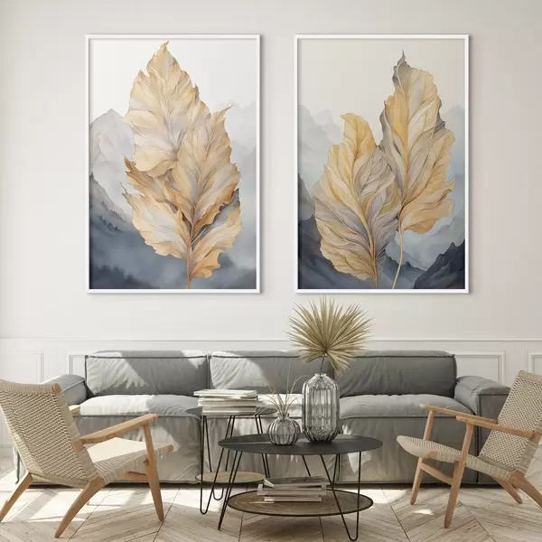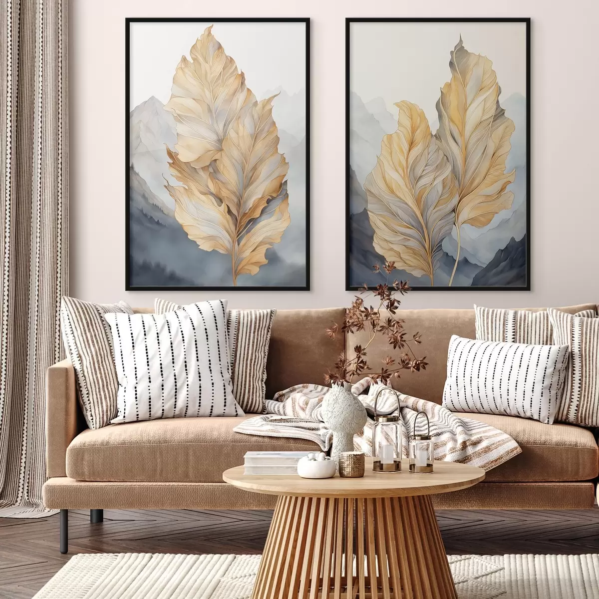 Plakatas Abstrakčios didelės, geltonos ir rudos spalvos lapai su sudėtingais detalėmis, kalnų peizažo fone Ne d01119