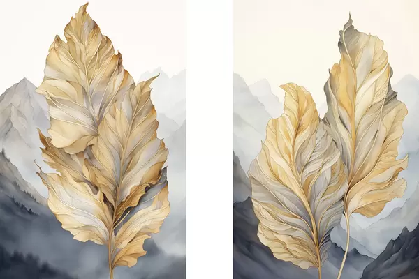 Plakatas Abstrakčios didelės, geltonos ir rudos spalvos lapai su sudėtingais detalėmis, kalnų peizažo fone Ne d01119