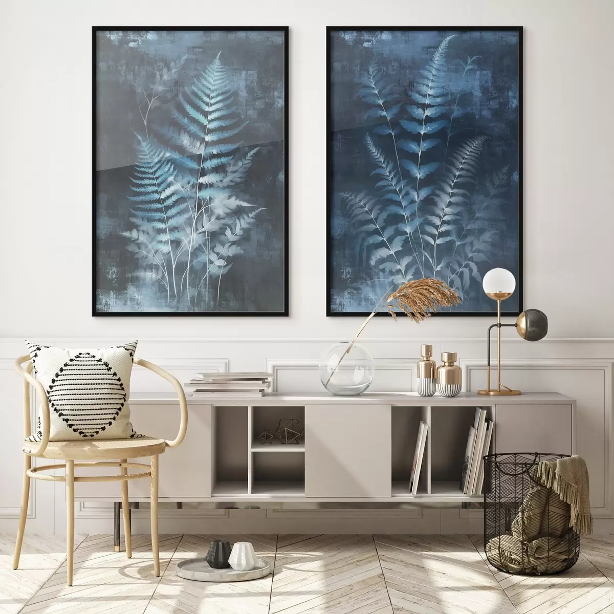 Plakatas Mėlyni paparčiai ir augalai prieš tamsų, tekstūruotą foną, akcentuojant sudėtingas detales, rentgeno efektas d01121