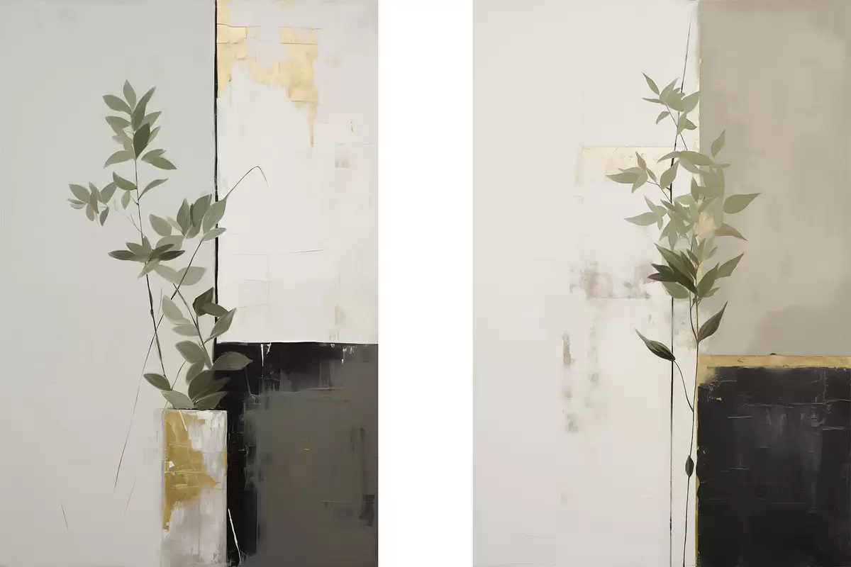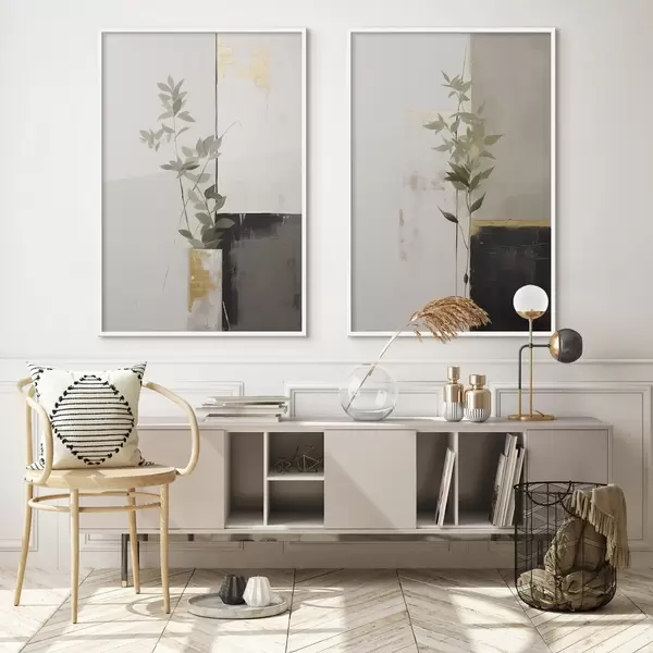 Plakatas Minimalistinis tekstūruotas paveikslas, vaizduojantis vazą su žaliais lapais abstrakčių geometrinių formų fone. Ne d01126