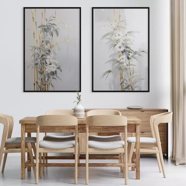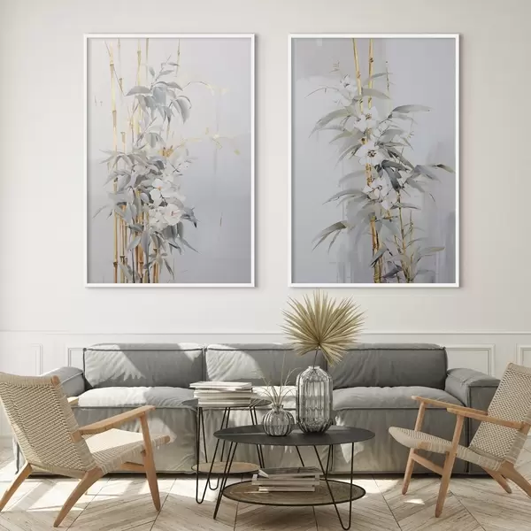Plakatas Abstrakčios bambuko stiebai su geltonais akcentais, subtiliais baltais žiedais ir šviesiai žaliais lapais, pilkas fonas d01127