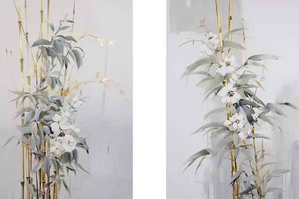 Plakatas Abstrakčios bambuko stiebai su geltonais akcentais, subtiliais baltais žiedais ir šviesiai žaliais lapais, pilkas fonas d01127