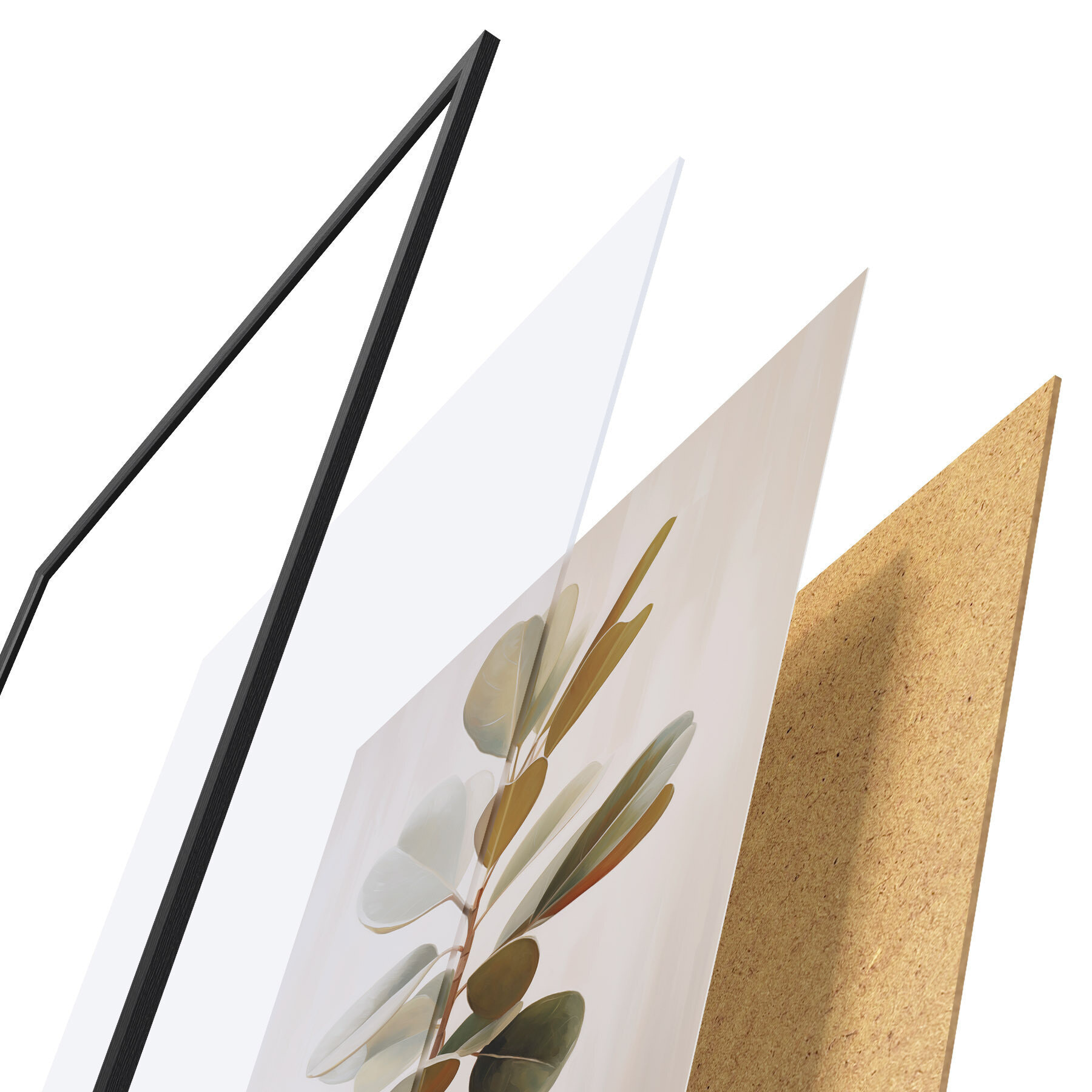 Plakatą sudaro rėmas, pleksiklas, atspausdintas vaizdas ir medžio drožlių plokštės pagrindas. Plakatą galima iš karto pakabinti ant sienos dėl kitoje pusėje esančių laikiklių.