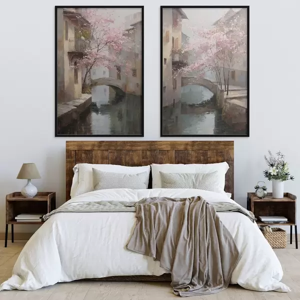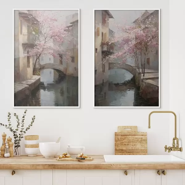 Plakatas romantiškas miesto peizažas su žydinčiu medžiu aliejaus tapybos stiliumi d01173